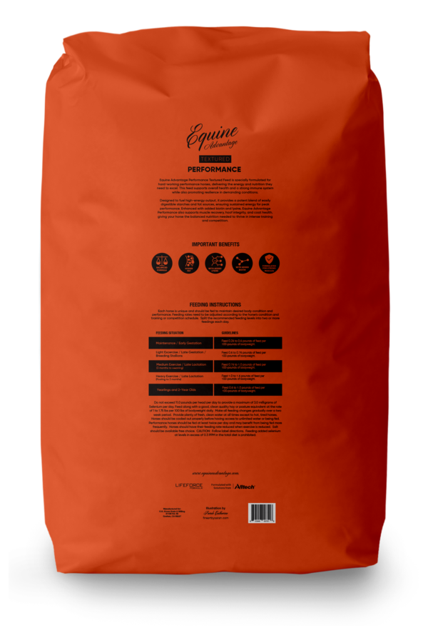 Each horse is unique and should be fed to maintain desired body condition and performance. Feeding rates need to be adjusted according to the horse’s condition and training or competition schedule. Split the recommended feeding levels into two or more feedings each day. Do not exceed a maximum inclusion level of 60% in the total diet so as not to exceed 0.3 PPM of added selenium per head per day. Feed along with a good, clean quality hay or pasture equivalent at the rate of 1 to 1.75 lbs per 100 lbs of bodyweight daily. Make all feeding changes gradually over a two week period. Provide plenty of fresh, clean water at all times except to hot, tired horses. Horses should be cooled out properly before having access to unlimited water or being fed. Performance horses should be fed at least twice per day and may benefit from being fed more frequently. Horses should have their feeding rate reduced when exercise is reduced. Salt should be available free choice. CAUTION: Follow label directions. Feeding added selenium at levels in excess of 0.3 PPM in the total diet is prohibited.